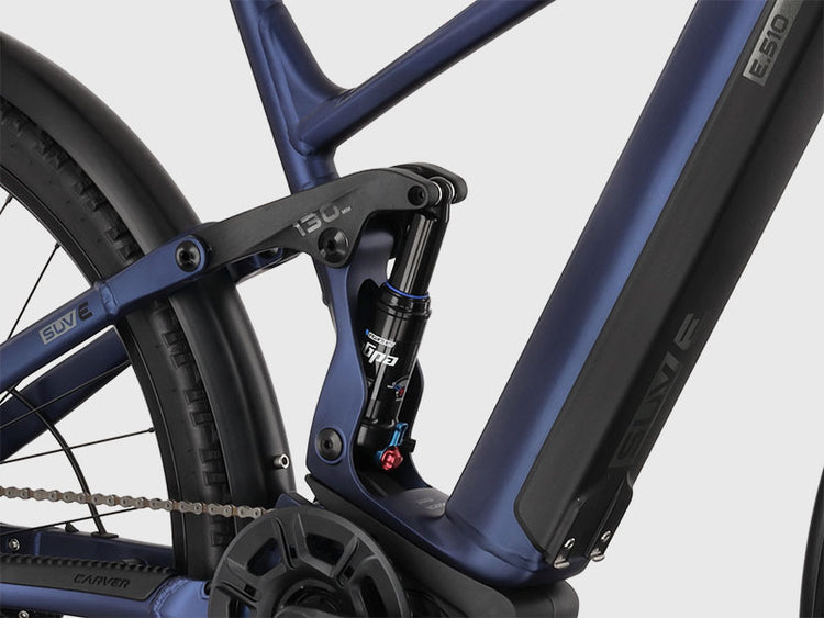 Mit den 130mm Federweg an Dämpfer und Federgabel bietet die SUV-E FS Series von Carver perfekten Fahrkomfort und Kontrolle. Egal ob auf unebenen Stadtstraßen oder abseits befestigter Wege, die Federung gleicht jede Unebenheit aus und sorgt für ein sanftes Fahrgefühl. Genieße optimalen Grip und sicheres Handling in jedem Gelände.